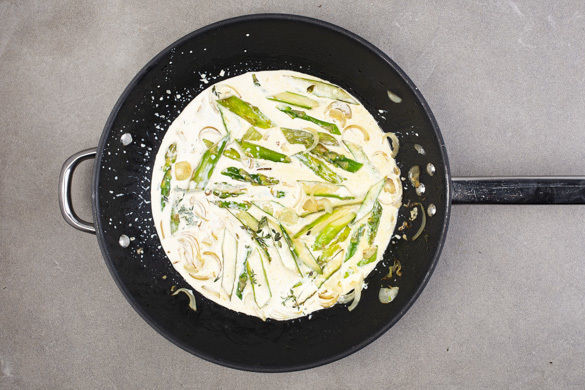 Den Spargel und die Zwiebeln in einer großen Pfanne mit 1EL Olivenöl bei starker Hitze ca. 2Min. anbraten. Die Hitze auf die niedrigste Stufe reduzieren, dann den Knoblauch hinzugeben und 1Min. mitbraten. Mit der Sojasahne ablöschen und mit dem Thymian sowie Salz und Pfeffer würzen.