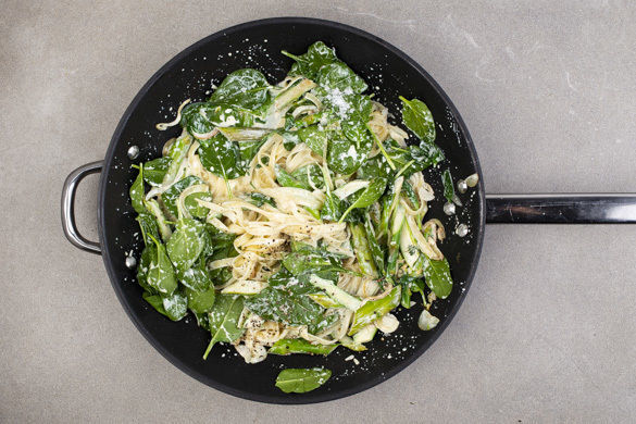 In Deutschland sind wir so versessen auf weißen Spargel, dass wir manchmal den kleinen grünen Bruder ganz vergessen. Dabei hat er auch seine Vorzüge: Er muss nur am unteren Drittel geschält werden, hat einen feinen, gemüsigen Geschmack und eine kürzere Garzeit als weißer Spargel. Und er sieht natürlich auch ganz fabelhaft aus und macht sich somit rundum gut in diesem schnellen veganen Pastagericht mit Pinienkernen und Spinat!