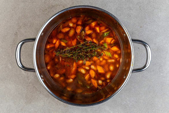 Die Chorizo in einem großen Topf bei mittlerer Hitze in 2–4Min. leicht knusprig anbraten, ggf. 1–2TL Öl zugeben. Aus dem Topf nehmen und abgedeckt beiseitestellen. Die Karotten, den Sellerie, die Schalotten und den Thymian in dem Topf mit 2EL Olivenöl 3–5Min. braten, bis die Schalotten glasig sind. Die bereitgestellte Butter mit der Gewürzmischung verrühren.