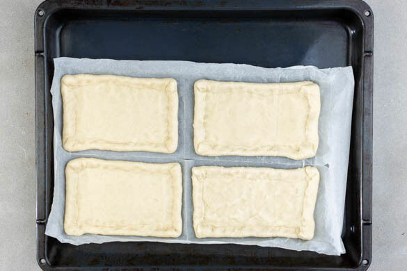 Die Teige mit dem Papier nach unten auf zwei Backblechen ausrollen, dann in je vier gleich große Rechtecke schneiden und die Ränder leicht aufrollen.