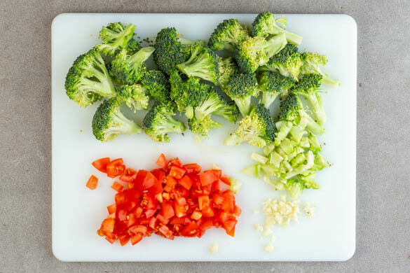 Den Knoblauch schälen und fein würfeln. Die Tomaten grob würfeln. Den Brokkoli in mundgerechte Röschen schneiden, den Strunk ggf. schälen und grob würfeln.