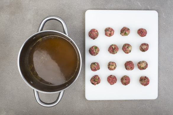 Das Hackfleisch mit der ½ der Zwiebeln, den Semmelbröseln, der ½ der Petersilie, den gehackten Kapern sowie Salz und Pfeffer gut vermengen, dann 2–3cm große Klopse formen. Diese vorsichtig in die Brühe geben und bei niedriger Hitze in 15–20Min. gar ziehen lassen. Wichtig: Die Brühe darf nur sieden, nicht kochen!