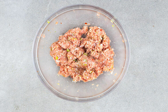 Das Hackfleisch mit der Sweet-Chili-Sauce, den weißen Lauchzwiebeln sowie je 1 kräftigen Prise Salz und Pfeffer vermengen, dann gründlich zu einer homogenen Masse verkneten.