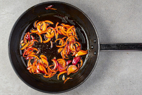 Die Zwiebeln und die ½ des Orangensafts in die Pfanne geben und mit 1TL Olivenöl oder Butter 4–5Min. sanft braten, bis die Zwiebeln weich und leicht gebräunt sind.