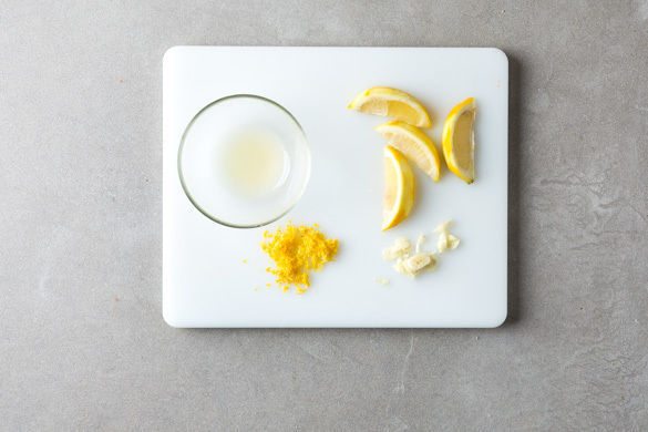 Den Knoblauch schälen und grob hacken. Die Zitronenschale abreiben, dann die Zitrone halbieren, eine Hälfte auspressen, die zweite Hälfte in Spalten schneiden.