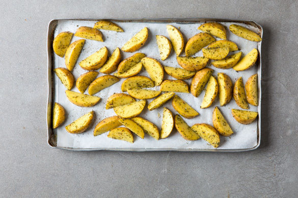 Inzwischen die Kartoffeln samt Schale in 1–2cm breite Spalten schneiden und auf einem mit Backpapier ausgelegten Backblech mit 1–2EL Olivenöl sowie der Gewürzmischung nach Geschmack vermengen. Gleichmäßig verteilen und im Ofen 20–25Min. backen, bis die Kartoffeln knusprig sind.