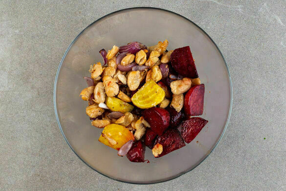 Den Backofen auf 220°C (200°C Umluft) vorheizen. Die Beten und die Zwiebeln jeweils schälen, halbieren und in 2–3cm breite Spalten schneiden. Alles mit 2EL Olivenöl und 1 kräftigen Prise Salz und Pfeffer vermengen, dann auf einem mit Backpapier ausgelegten Backblech verteilen.