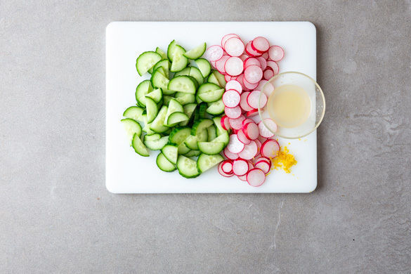 Ca. 1TL Zitronenschale abreiben, dann die Zitrone halbieren und auspressen. Die Gurke längs halbieren und quer in dünne Scheiben schneiden. Die Radieschen putzen und ebenfalls in feine Scheiben schneiden.