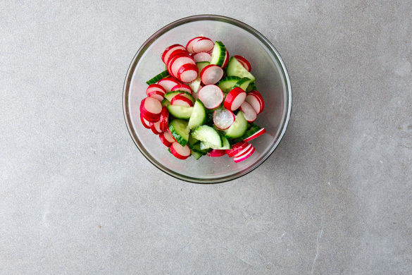 Die Gurken- und die Radieschenscheiben mit je 1 Prise Salz und Zucker sowie je 1EL Olivenöl und Essig vermengen, beiseitestellen und ziehen lassen. Mit Salz und Pfeffer abschmecken.