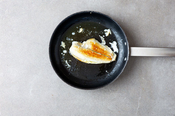 Den Fisch mit etwas Küchenkrepp trocken tupfen und Gräten ggf. jetzt mit einer Pinzette entfernen oder später beim Essen darauf achten. Den Fisch in einer großen Pfanne mit 1–2EL Olivenöl bei mittlerer Hitze 2–3Min. goldbraun anbraten. Aus der Pfanne nehmen und warm halten.