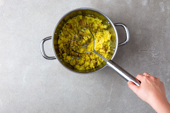 In einem großen Topf ausreichend gesalzenes Wasser für die Kartoffeln zum Kochen bringen. Die Kartoffeln in 2–3cm große Stücke schneiden, in das kochende Wasser geben und in 10–15Min. bissfest kochen.