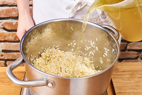 Die Zwiebeln in einem großen Topf mit 1–2EL Olivenöl bei niedriger Hitze 2–3Min. glasig dünsten, dann den Reis hinzufügen und 1Min. anrösten. Nach und nach etwas Brühe unter Rühren zum Reis geben und köcheln lassen, bis der Reis die Brühe aufgesogen hat. Diesen Vorgang wiederholen, bis die Brühe aufgebraucht und der Reis gar ist, das dauert 18–20Min.