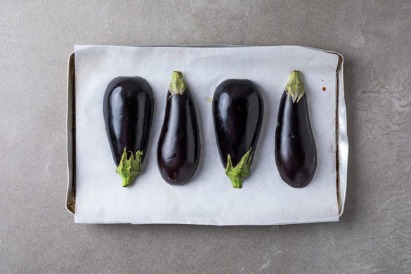 Die Auberginen mit 2–3TL Olivenöl einpinseln, mit der Schnittfläche nach unten auf ein mit Backpapier ausgelegtes Backblech legen und 12–15Min. im Ofen backen, bis die Haut leicht welk wird. Die Auberginen wenden, mit etwas Salz bestreuen und weitere 8–10Min. backen, bis die Oberfläche goldbraun ist. Den Ofen ausschalten und die Auberginen darin warm halten.