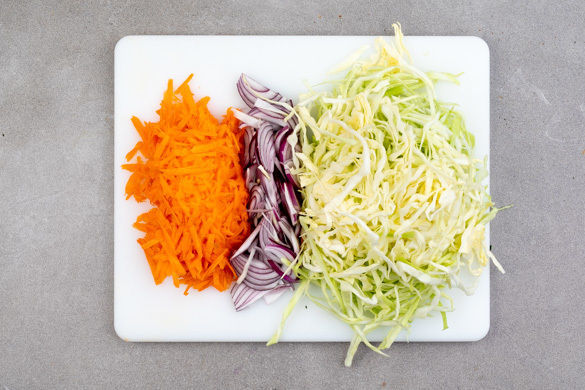Den Spitzkohl ggf. verlesen. Die Karotte schälen und mit einer Küchenreibe grob raspeln. Die Zwiebel schälen, halbieren und in feine Streifen schneiden.
