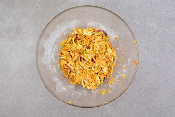Das Kichererbsenmehl in einer großen Schüssel mit 2TL Backpulver, dem Currypulver und 1 Prise Salz verrühren. Dann den Spitzkohl, die Karotten und die Zwiebeln hinzugeben und mit ca. 75ml Wasser zu einer teigartigen Masse verrühren. Ggf. etwas mehr Wasser hinzugeben.