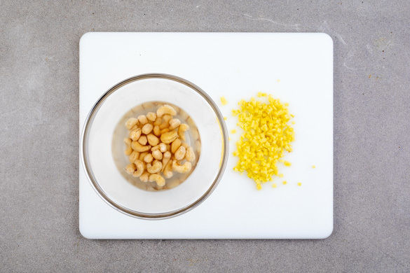 Den Backofen auf 200°C Umluft (220°C Ober-/Unterhitze) vorheizen. 200ml Wasser in einem Wasserkocher zum Kochen bringen. Die Cashews in einer hitzefesten Schüssel mit dem kochenden Wasser übergießen und beiseitestellen. Den Ingwer schälen und grob hacken. Tipp: Der Ingwer lässt sich am besten mit einem kleinen Löffel schälen.