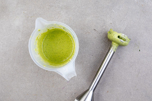 Die Minzeblätter von den Stängeln zupfen. Die Cashews inkl. der 1/2 des Wassers mit dem Ingwer, dem Koriander samt Stängeln, den Minzeblättern und der 1/2 der Tamarindenpaste in einem hohen Gefäß mit einem Stabmixer pürieren. Mit Salz und Pfeffer abschmecken und nach Wunsch mehr Wasser hinzugeben.