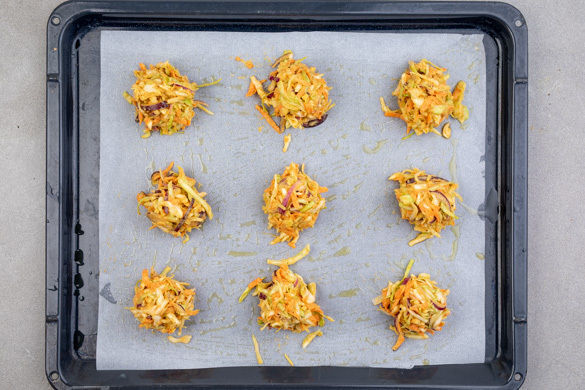 Das Kichererbsenmehl in einer großen Schüssel mit dem Backpulver, dem Currypulver und 1 Prise Salz verrühren. Dann den Spitzkohl, die Karotten und die Zwiebeln hinzugeben und mit 100–150ml Wasser zu einer teigartigen Masse verrühren. Ggf. etwas mehr Wasser hinzugeben.
