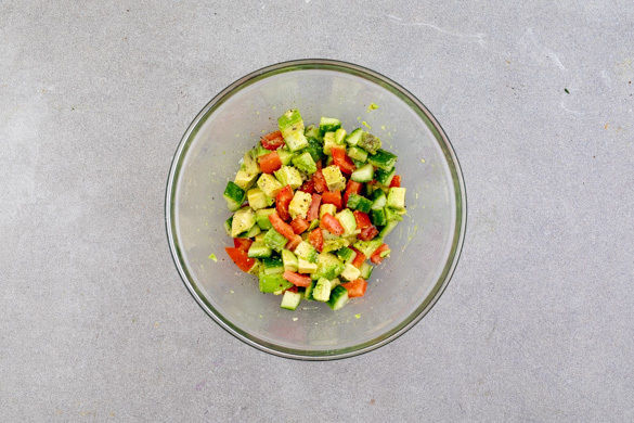 Die Gurke und die Tomaten in ca. 1cm große Würfel schneiden. Die Avocados halbieren, entkernen und das Fruchtfleisch in der Schale in ca. 1cm große Würfel schneiden. Die Avocadowürfel herauslöffeln und mit den Gurken, den Tomaten, der restlichen Tamarinde, 1–2EL Olivenöl und 1 Prise Zucker mischen. Die Pakoras mit dem Avocadosalat und dem Dip servieren.