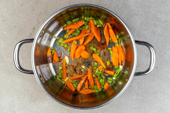 Die Karotten, den Sellerie, die weißen Lauchzwiebelringe und 1EL Pflanzenöl in den Topf geben und bei mittlerer Hitze 2–3Min. braten.