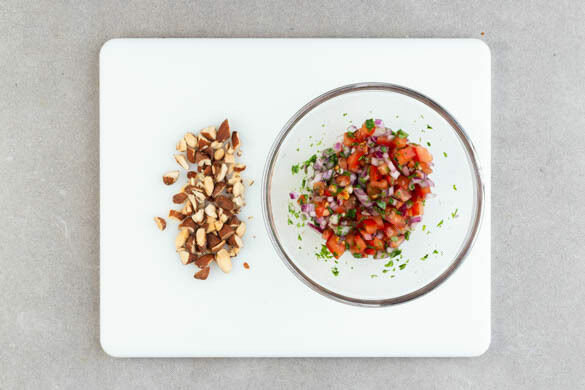 Die Tomate fein würfeln. Den Knoblauch schälen und fein pressen. Die Korianderblätter fein schneiden, mit den Tomaten, dem Knoblauch, den Zwiebelwürfeln, 1EL Limettensaft und je 1 Prise Salz und Pfeffer mischen. Die Mandeln grob hacken. Das Fleisch mit der Sauce, dem Blumenkohlreis und der Salsa anrichten, mit den Mandeln garniert servieren.