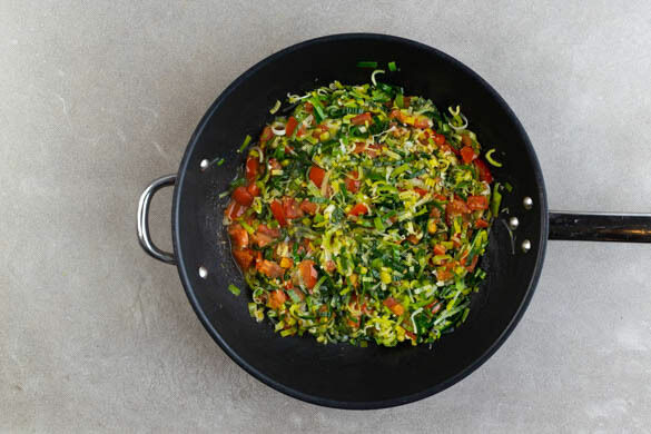 Inzwischen den Lauch jeweils längs halbieren und quer in dünne Scheiben schneiden, dann in einer großen Pfanne mit 1EL Pflanzenöl und je 1 kräftigen Prise Salz, Pfeffer und Zucker bei mittlerer bis starker Hitze in 4–5Min. weich braten.