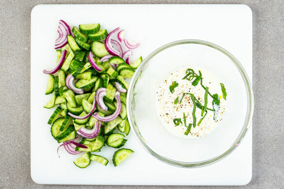 Inzwischen die Minze von den Stängeln zupfen und fein schneiden. Die ½ des Joghurts mit der Minze, dem restlichen Knoblauch, 2TL Olivenöl, 1EL Essig, ½TL Salz und Pfeffer nach Geschmack zu einem Dressing verrühren. Die Gurke längs halbieren, in dünne Scheiben schneiden und mit den restlichen Zwiebeln und dem Dressing vermengen.