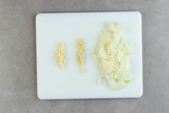 Die Mandeln in einem mittelgroßen Topf ohne Fett bei mittlerer Hitze 1–2Min. goldbraun anrösten. Vorsicht, sie können schnell zu dunkel werden. Aus dem Topf nehmen und beiseitestellen. Den Knoblauch schälen und sehr fein würfeln oder durch eine Knoblauchpresse drücken. Die ½ des Ingwers schälen und fein würfeln. Die Zwiebeln schälen, halbieren und in feine Streifen schneiden.