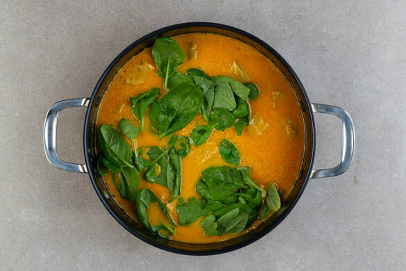 Die Zwiebeln und den Knoblauch in demselben Topf mit 2EL Margarine bei mittlerer Hitze 2–3Min. anschwitzen, dann die Schnetzel, die übrige Gewürzmischung, den Ingwer und die Currypaste zugeben. Alles miteinander vermengen und ca. 1Min. braten, dann die Kokosmilch und 100ml Wasser angießen. Das Korma bei niedriger Hitze 4–6Min. köcheln lassen.