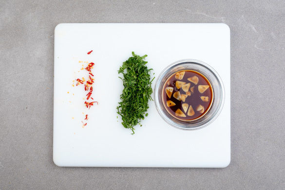 Den Limettensaft mit der Sojasauce, der 1/2 der Fischsauce, dem Knoblauch und 1EL Pflanzenöl verrühren. Tipp: Wer keine Fischsauce mag, kann sie auch weglassen. Den Koriander samt Stängeln grob hacken. Die Chili in feine Ringe schneiden. Für weniger Schärfe die Kerne entfernen.