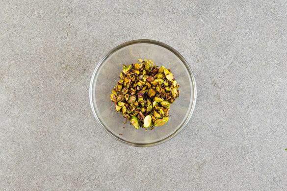 Die Pistazien und die ½ des Kümmels in einer kleinen Pfanne bei mittlerer Hitze 2–3Min. anrösten. Tipp: Wer mag, kann auch mehr Kümmel verwenden. Dabei regelmäßig rühren, damit nichts anbrennt. Aus der Pfanne nehmen, mit 1TL Olivenöl beträufeln und grob hacken. Mit je 1 Prise Salz und Pfeffer würzen.
