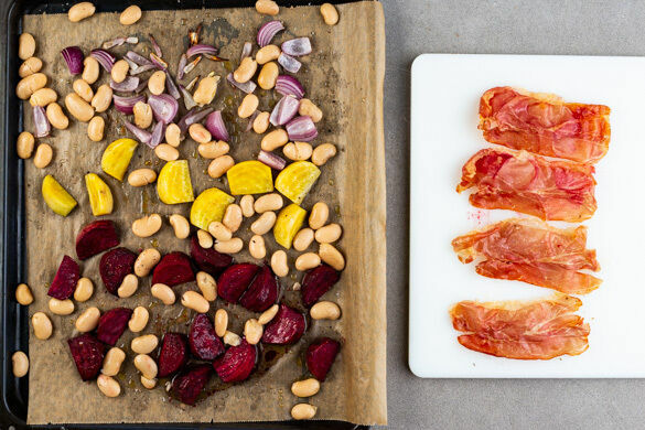 Den Schinken auf das Gemüse legen und alles im Ofen 6–7Min. backen, bis der Schinken goldbraun und knusprig ist. Den Schinken herausnehmen und abkühlen lassen. Die Bohnen mit den Beten und den Zwiebeln vermengen und weitere 18–19Min. backen, bis die Beten gar sind.