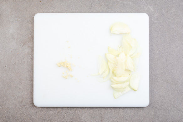In einem mittelgroßen Topf ausreichend gesalzenes Wasser für die Pasta zum Kochen bringen. Die Zwiebel schälen, halbieren und in feine Streifen schneiden. Den Knoblauch schälen und fein hacken.
