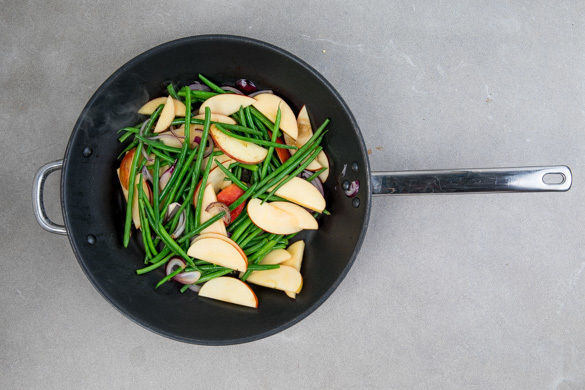 Die Zwiebeln in derselben Pfanne mit 1EL Olivenöl bei mittlerer Hitze ca. 1Min. anbraten. Die Bohnen und die Apfelscheiben dazugeben und 2–3Min. mitbraten, bis die Bohnen gar sind. Das Gemüse mit Salz und Pfeffer würzen.