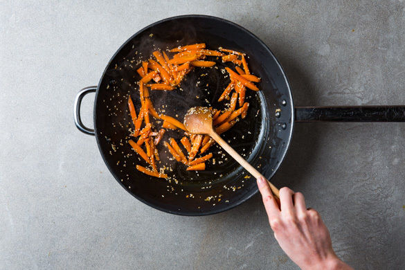 Die Karotte schälen, längs halbieren und schräg in dünne Streifen schneiden. Den Knoblauch schälen und fein hacken. Die Peperoni in feine Ringe schneiden. Für weniger Schärfe die Kerne entfernen. Die Karotten und den Knoblauch in der Pfanne mit 1–2EL Pflanzenöl bei starker Hitze 3–5Min. anbraten. Mit etwas Sojasauce würzen und den Sesam untermischen.