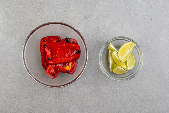 Die Paprika vierteln, entkernen und in grobe Stücke schneiden. In einer großen Pfanne mit 1EL Pflanzenöl bei mittlerer Hitze 4–5Min braten, bis die Paprika auf beiden Seiten schön angeröstet und gebräunt ist. Anschließend in eine Schüssel geben und abgedeckt ca. 2Min. ausdampfen lassen. Die Pfanne mit etwas Küchenkrepp auswischen. Die Limette halbieren und auspressen.