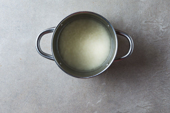 In einem mittelgroßen Topf 800ml leicht gesalzenes Wasser zum Kochen bringen. Den Reis in einem Sieb unter fließendem Wasser abspülen, bis das Wasser klar bleibt. Sobald das Wasser kocht, den Reis hineingeben und bei niedrigster Hitze 10–12Min. kochen, bis das Wasser aufgesogen und der Reis gar ist. Noch ca. 5Min. ohne Hitzezufuhr abgedeckt ziehen lassen.