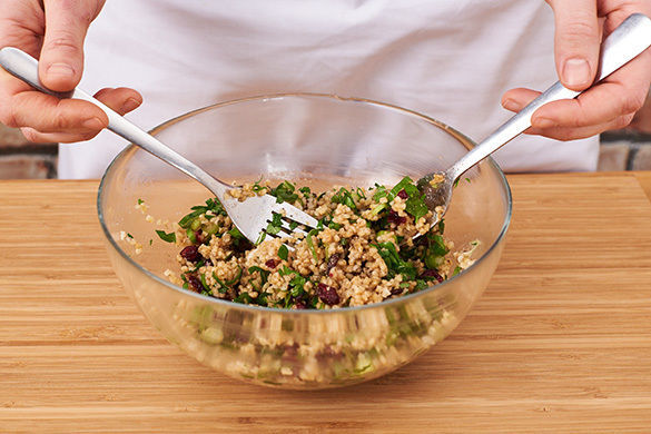 Den Bulgur in das kochende Wasser geben und für 8–10Min. bissfest kochen. In ein Sieb abgießen und ausdampfen lassen.
