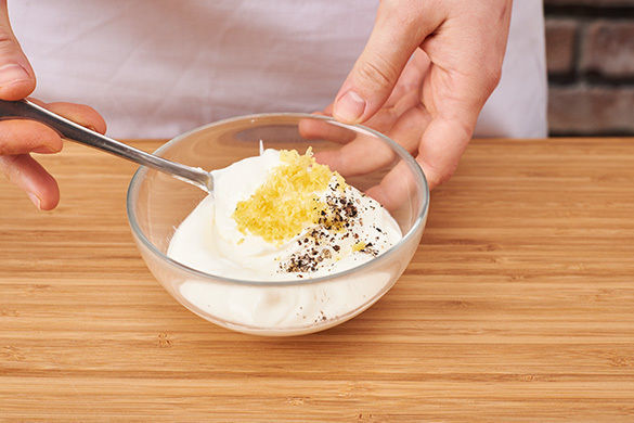 In den letzten ca. 8Min. der Backzeit die Mandeln zu den Karotten aufs Blech geben und mitrösten, bis sie goldbraun sind. Inzwischen den Joghurt mit 1EL Zitronensaft und 1TL Zitronenabrieb verrühren und mit Salz und Pfeffer abschmecken.