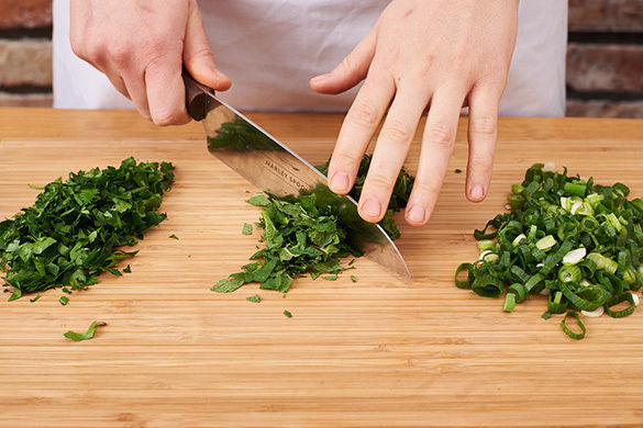Die Petersilie samt Stängeln grob hacken. Die Minzeblätter von den Stängeln zupfen und ebenfalls grob hacken. Die Lauchzwiebeln in feine Ringe schneiden. Die Selleriestangen längs halbieren und schräg in dünne Scheiben schneiden.