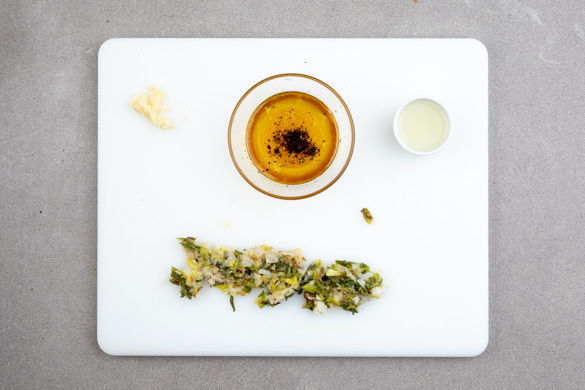 Die Lauchzwiebeln mit 1/2EL Olivenöl einreiben und auf ein Backblech geben. Im Ofen 4–6Min. grillen, bis die Lauchzwiebeln weich und sehr dunkel sind. Nach der Hälfte der Zeit einmal wenden. Nach dem Grillen vom Blech nehmen und auskühlen lassen.