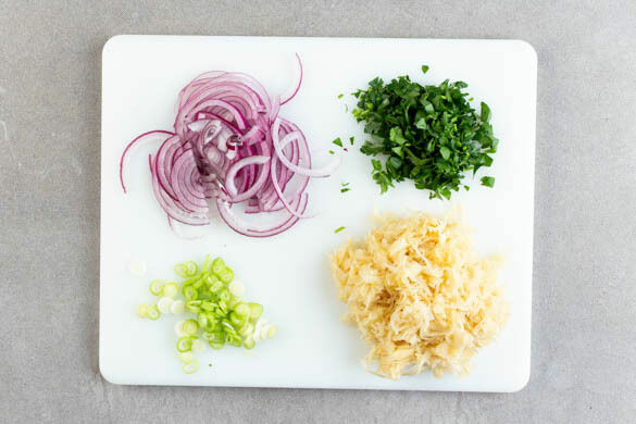 Inzwischen die Zwiebeln schälen, halbieren und in feine Streifen schneiden. Die Lauchzwiebeln in feine Ringe schneiden. Die Petersilie samt Stängeln fein schneiden. Das Sauerkraut mit den Händen auspressen.