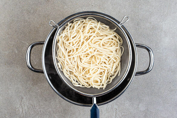 Die Nudeln in das kochende Wasser geben und in 4–6Min. bissfest kochen. In ein Sieb abgießen und kalt abschrecken.