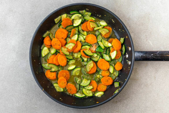 Die Karotte ggf. schälen und schräg in ca. 0,5cm breite Scheiben schneiden. Die Zucchini längs vierteln und quer in ca. 0,5cm breite Stücke schneiden.
