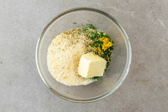 Die ½ der Zitronenschale abreiben, anschließend die Zitrone in Spalten schneiden. Den Käse fein reiben. Die Kräuter samt Stängeln fein hacken. ½EL der Kräuter für die Garnitur aufbewahren. Die übrigen Kräuter mit der Zitronenschale, dem Käse, dem Paniermehl, der zimmerwarmen Butter und 1 Prise Gewürzmischung vermengen.