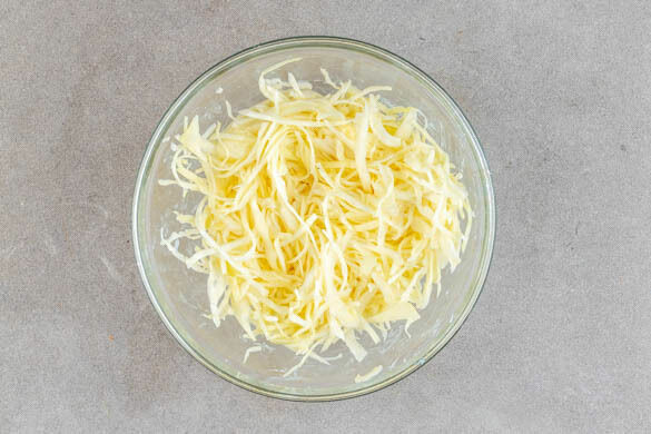 Den Backofen auf 220°C (200°C Umluft) vorheizen. Den Weißkohl mit 2TL Salz und 1TL Zucker gründlich verkneten. 3EL Mayonnaise, 2EL Essig und 1 kräftige Prise Pfeffer unterrühren. Den Krautsalat beiseitestellen und ziehen lassen.