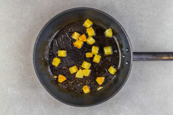Die Ananas in ein Sieb abgießen und abtropfen lassen, dabei den Saft auffangen. Die Ananas in einer großen Pfanne mit 2EL Pflanzenöl bei starker Hitze in 3–4Min. leicht bräunlich anbraten.