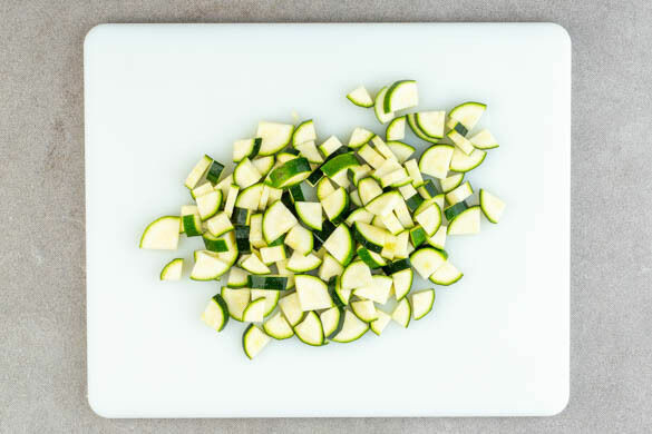 Die Zucchini längs vierteln und quer in dünne Scheiben schneiden.