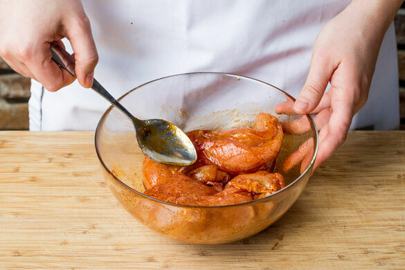 In einem mittelgroßen Topf ausreichend Wasser mit dem Brühgewürz für die Nudeln zum Kochen bringen. Das Fleisch mit etwas Küchenkrepp trocken tupfen und längs halbieren. Die 1/2 des Paprikapulvers mit 1–2EL Olivenöl verrühren und das Fleisch gründlich mit dem Gewürzöl vermengen. Bis zur weiteren Verwendung beiseitestellen.