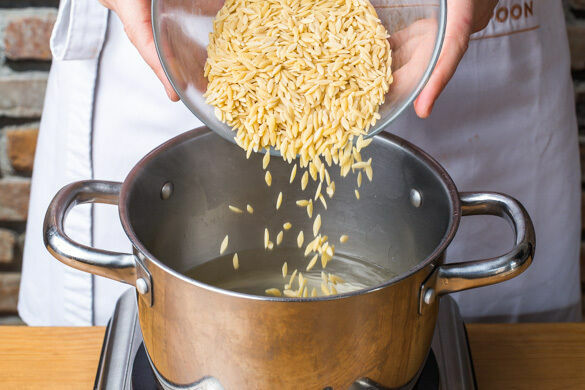 Die Risoni in die kochende Brühe geben und in 7–9Min. unter gelegentlichem Rühren bissfest kochen. In ein Sieb abgießen, kalt abschrecken und abtropfen lassen.
